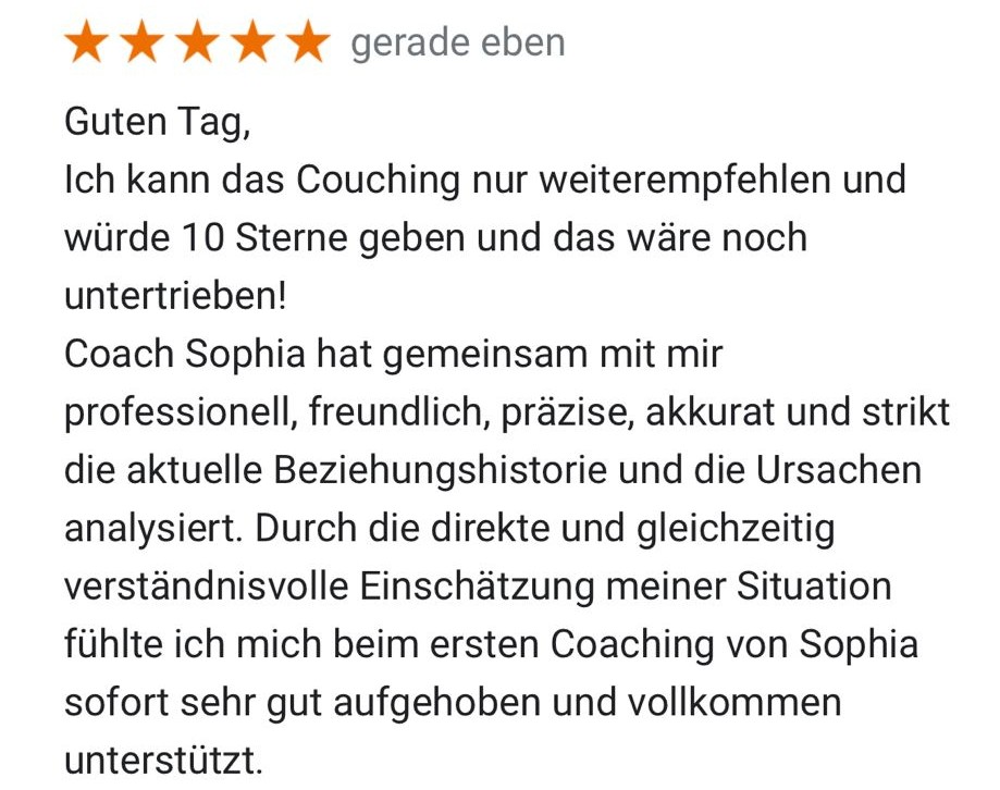 Coaching-Erfahrung habe ich unter anderem besonders in den Themen Beziehung und Partnersuche, Trennung und Liebeskummer, Konflikte und Entscheidungen, Karriere und Studium, Sinn und Motivation, Stressbewältigung und Achtsamkeit, Selbstbewusstsein und Selbstliebe, soziale und emotionale Kompetenz …